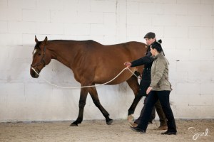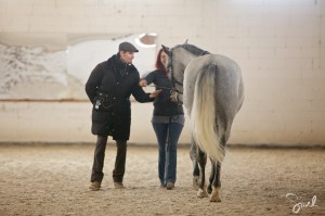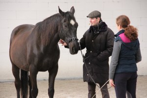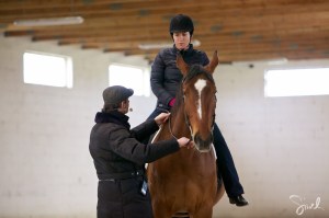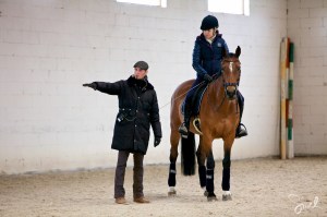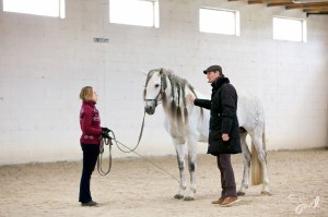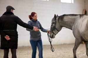 In the academic art of riding, we strive for more and more refined aids and a better balance. Right from the start, the horse is give responsibility for his own movement and we don’t force the horse into a certain frame with side reins during lunging or heavy contact on the reins during riding. Several times, Marius repeated: “I don’t have fun pulling my horses in the mouth!” In his experience, horses don’t know what we want when we pull on the reins and they usually go against the pressure. Thus, educating the aids is of utmost importance. Our aids should help the horse to understand what we expect of him. Right from the start, our aids should be a light as possible and we search for every responds from the horse that goes in the right direction. Usually, we need to do much less than we think! If we are soft, the horses will comply just as softly. So it was a pleasure to see reins lengthening during this clinic and legs and seats becoming more and more relaxed. The horses answered with a better forward, softer bending and a more relaxed mind.