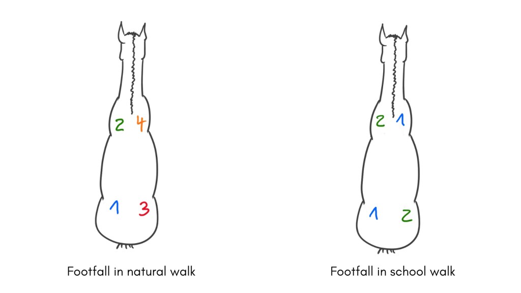We distinguish between the natural walk and the schooled walk. The natural walk is a four beat. The sequence of the legs is inside hind, inside front, outside hind, outside front. You can remember “same side but not at the same time” (in German: “gleichseitig, aber nicht gleichzeitig”).