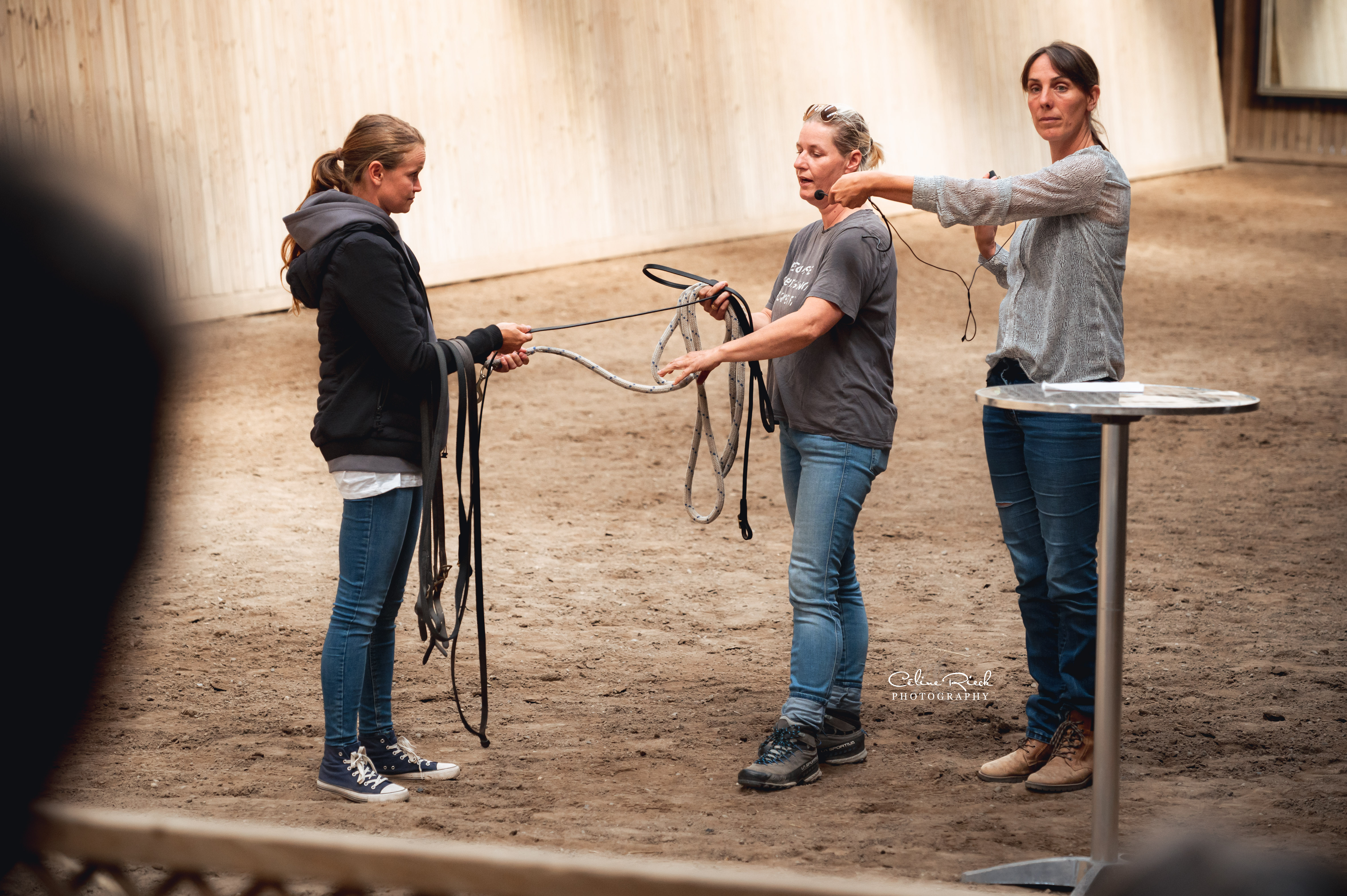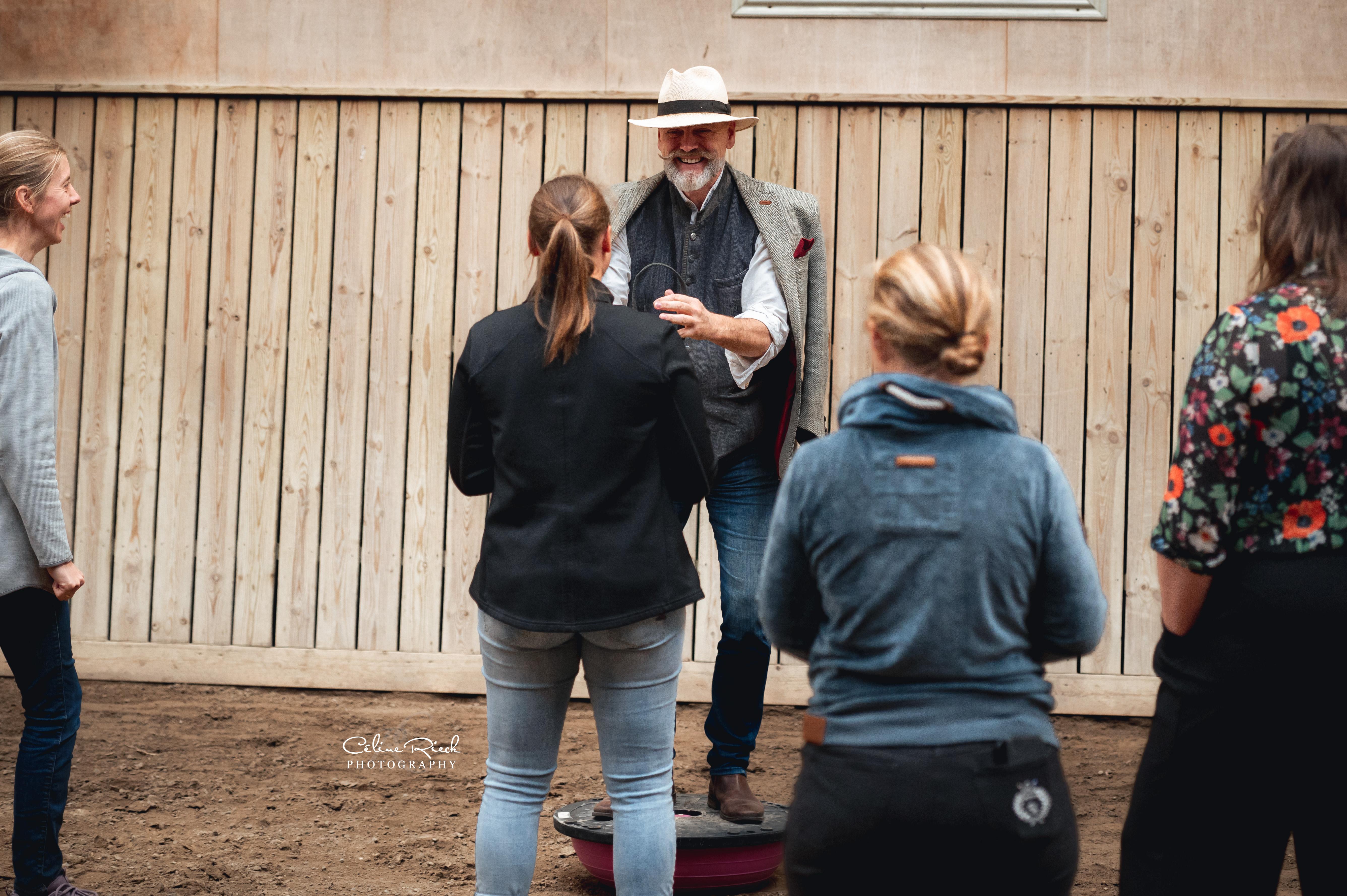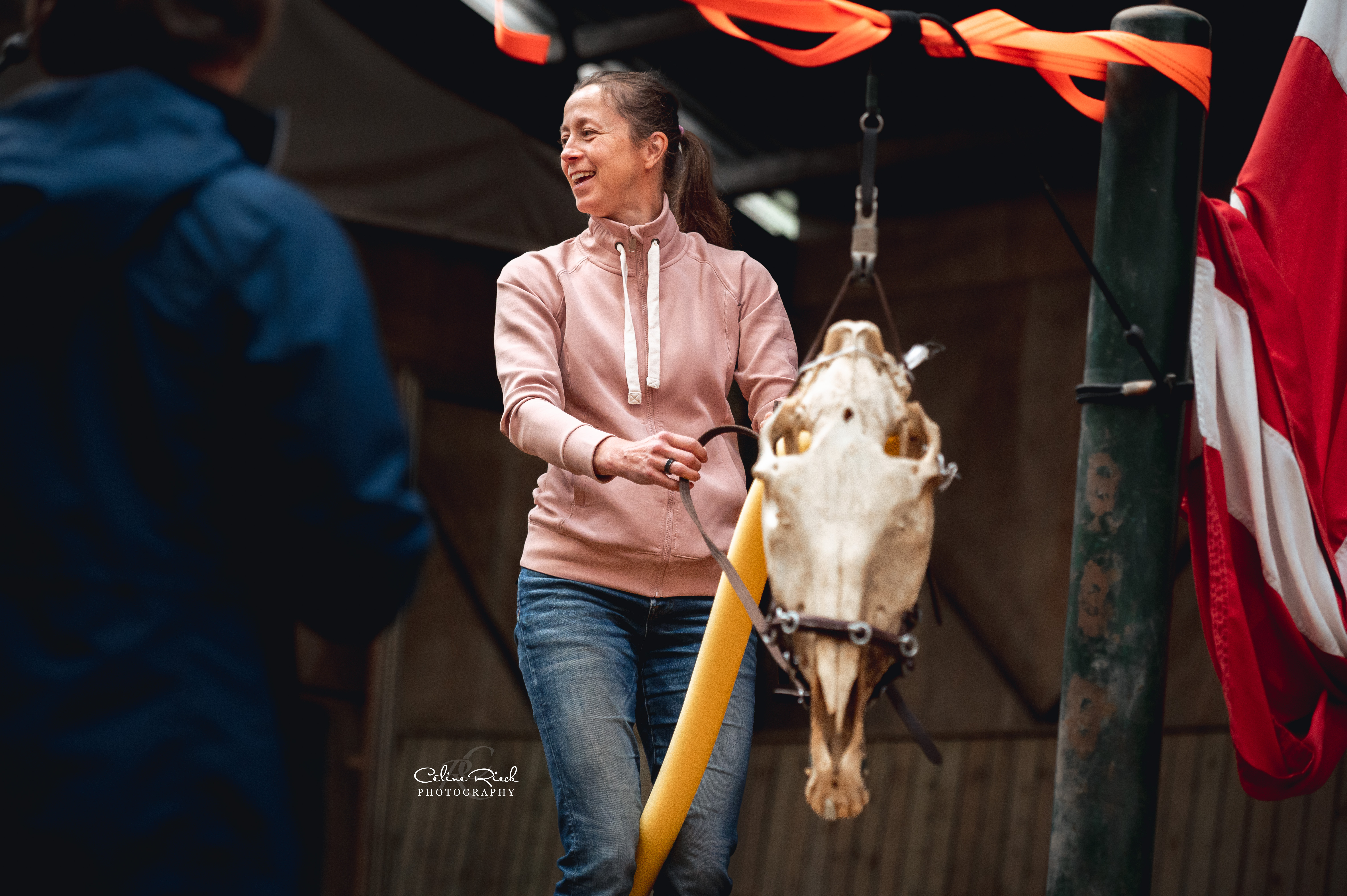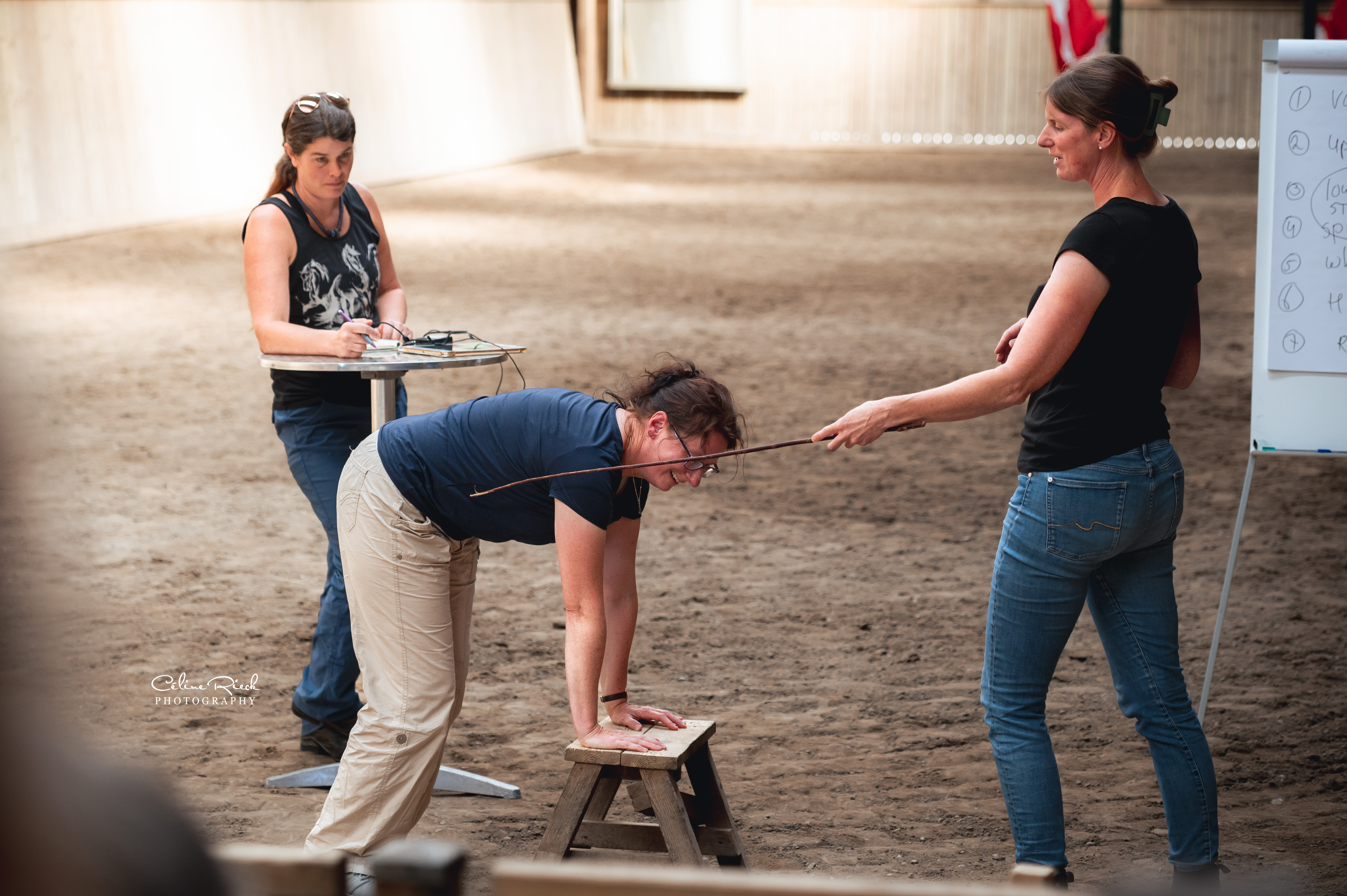 On Thursday the Summer Academy 2023 started with Bent and Kathrin showing the work with their horses. The topic of this year’s academy was “The secondary aids”, after we had been nerding about the seat for two years. Bent’s older horse Tyson is his last horse he educated in the pilars. His younger horses are not educated in the pilars anymore, for good reason: Bent thinks every equestrian discipline should re-evaluate their methods and choose methods according to modern ethical standards. He believes that work in hand and long reining are much better and less stressful ways to educate horses than pilar work, for the simple reason that the horse can move away if it becomes stressed. Bent and Kathrin showed us their latest developments and shared their thoughts about certain problems or challenges.